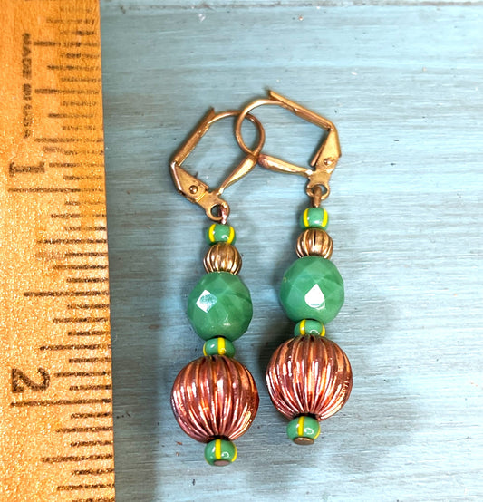Green Cherry Brand Glass and Vintage Copper Metal. One Age Spot on Copper. Hypoallergenic French Earring Hooks, Gold Plated Wire.