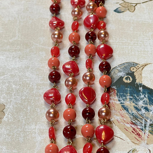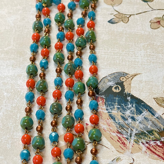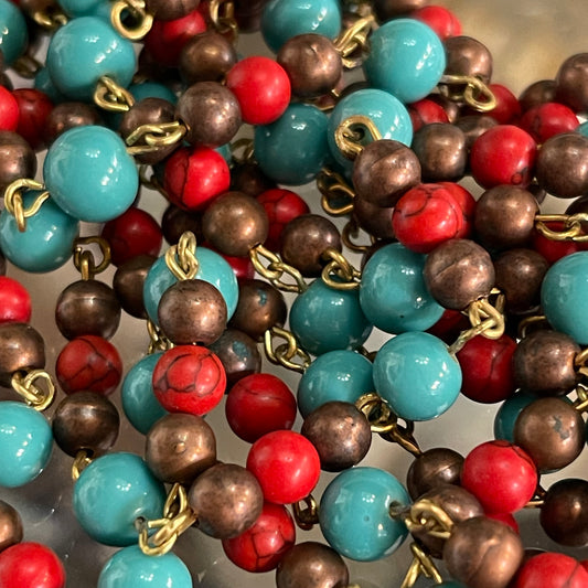 Handcrafted By The Bohemian Jewelry Co. 5.4mm and 7.2mm, South West Style Copper Red and Turquoise Glass Bead Chain. Sold by the foot.