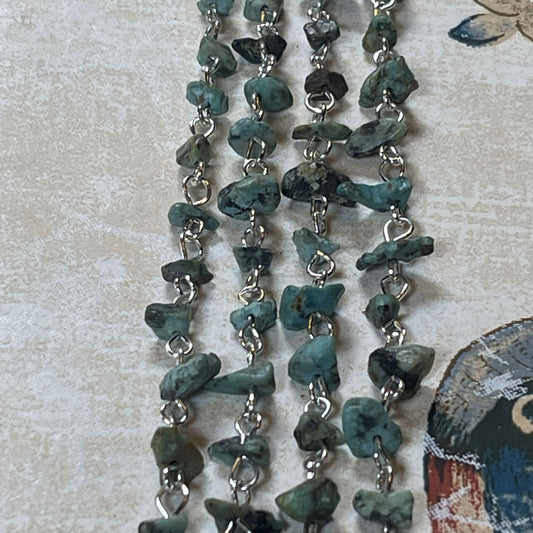 Various sizes of 4mm to 6mm Nuggets of African Jasper Dyed a Turquoise Color. Bead Chain, With silver color wire. Sold by the foot.