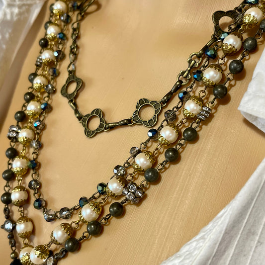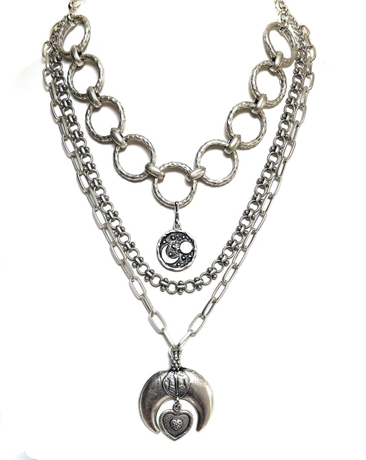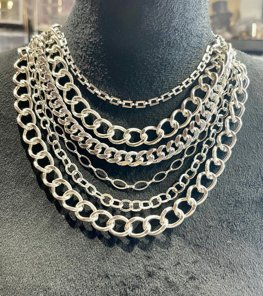 Bright Silver, Multi-Layered Chain, Necklace Adjustable. Silver Plate Steel.
