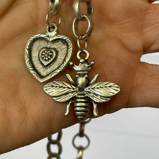 Silver Plate. Pendant Heart and Queen Bee necklace. Large Pendant Statement Necklace.