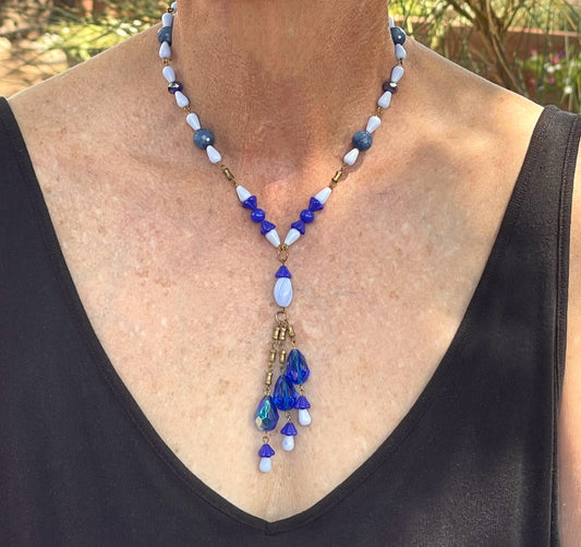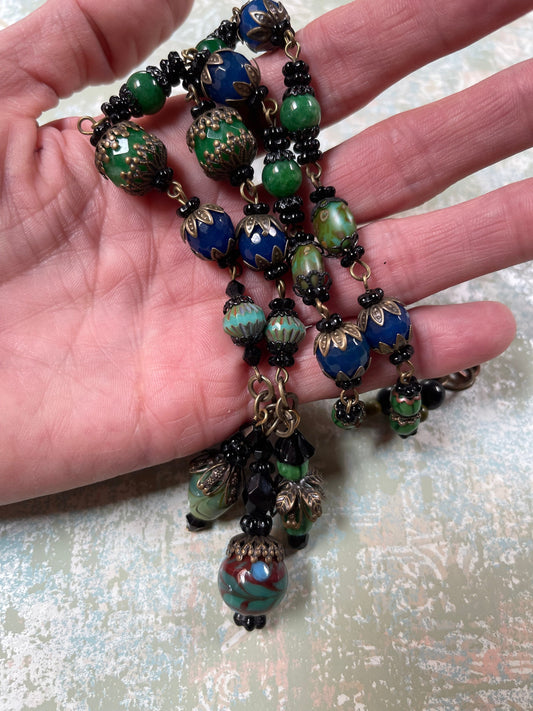 Hand-Made Boho Necklace With Vintage Dark Cobalt Blue and Green Beads.