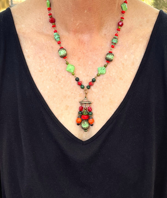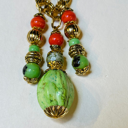 Hand-Made With Vintage Green and Red Vintage Beads. Faux Turquoise Stones. Very Boho.