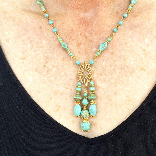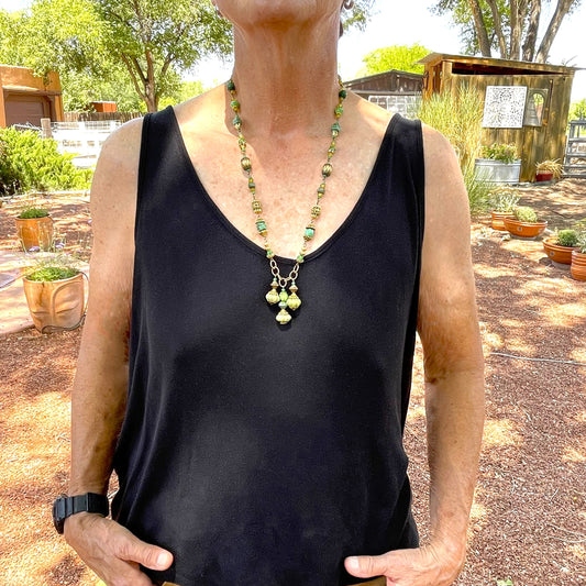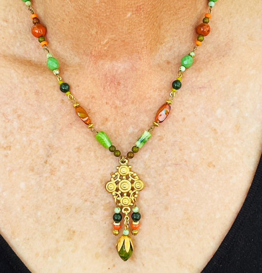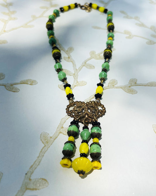 Gold, Green, Yellow, and Black Vintage Glass Beads. With Vintage Brass filigree pendant.