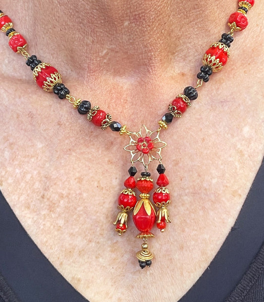 Vintage, Red, Dark Red, and Black Czech Glass Beaded Necklace. With Gold accents.