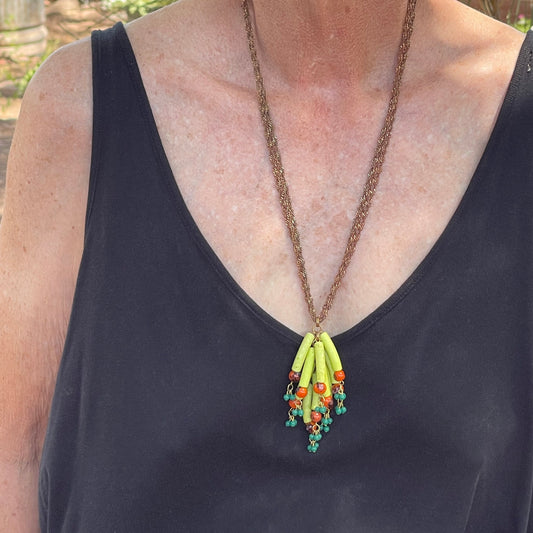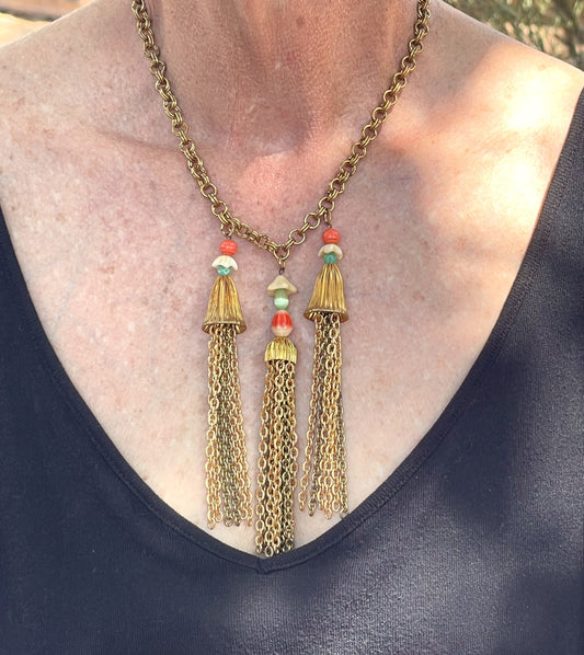 Vintage Gold Chain Three Drop Tassel Necklace. With orange and green beads and cream-colored glass flowers.