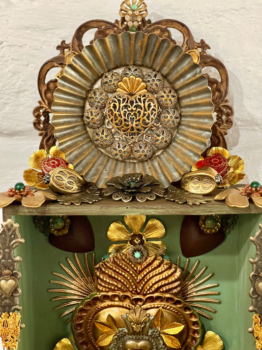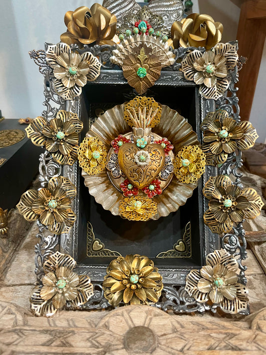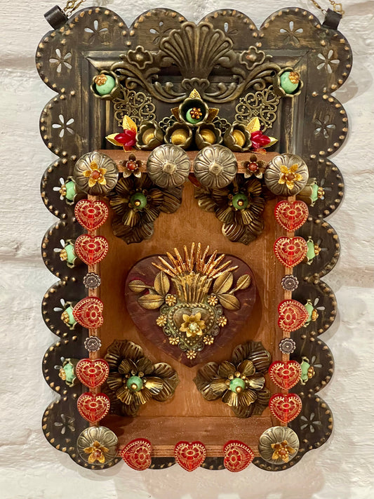 Gold and Silver metal adorned wood shrine, Sacred Heart Wall Shrine.